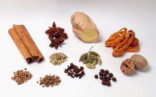Oben v. links nach rechts: Zimt, Sternanis, Ingwer, Macis;