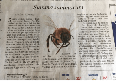 Während die Honigbiene in der deutschen Öffentlichkeit höhere Sympathiewerte hat als Papst Franziskus, störten sich die Rentner aus der rheinischen Mittelstadt an dem unerträglichen Bienen-Lärm zweier Bienenvölker im Garten ihrer Nachbarin. Die Flügelschwingungen der Nektarsammlerinnen führen bei den alten Leuten zu ganz unerwarteten Wirkungen. „Das Summen macht mich depressiv!“ – so zitiert das Boulevardblatt „Express“ den Rentner. Seine Frau klagt „Ich halte dieses Summen nicht mehr aus“. Die türkische Bienenhalterin schwört dagegen auf die „therapeutische Wirkung“ ihrer Bienen. Der Fall belegt schon mal eindrucksvoll die alte rheinische Lebensweisheit „Jeder Jeck ist anders“.