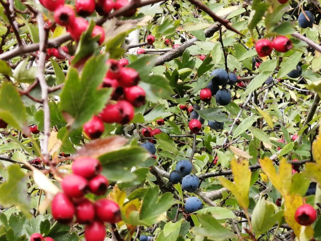 In den unbewirtschafteten, kalkhaltigen Böden der „Kalkeifel“ gedeihen beide Pflanzen ausgezeichnet und tragen in diesem Herbst reichlich Früchte. Die sind ein gutes Futter für zahlreiche hier überwinternde Vogelarten. Die Schlehe zählt zu den wichtigsten Wildsträuchern für Tiere. Etwa 20 Vogelarten bietet sie Nahrung und Schutz zwischen ihren dornigen Ästen.
